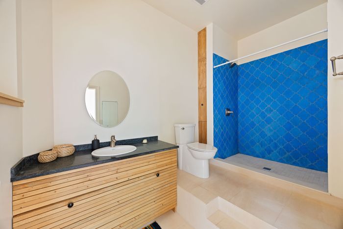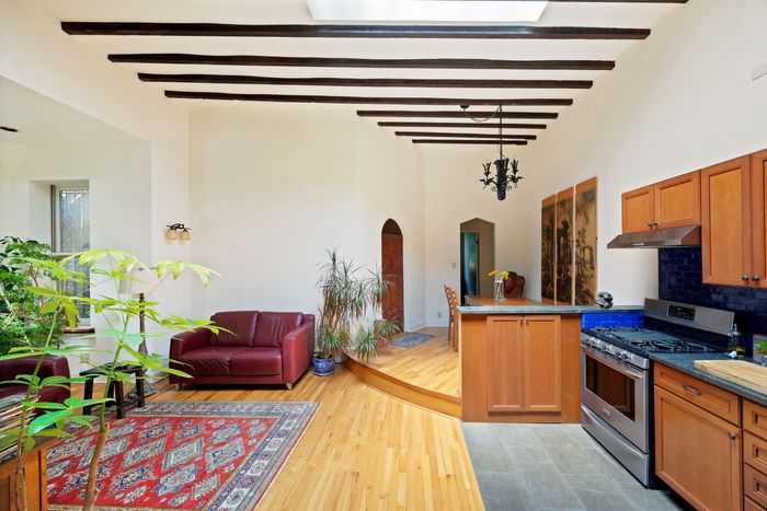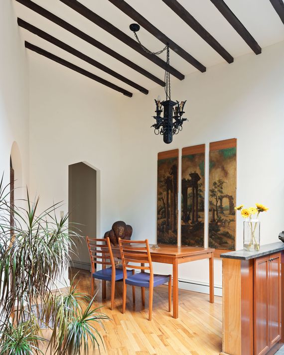 But first, he had to make it a home out of the old, windowless box. He redid the roof, exposing the shop’s old beams, added a front door, and cut windows with a mallet and a chisel. Later, he built an entire second building in the back — a living space that includes three bedrooms, a kitchen, and a dining and living room elegantly placed around a courtyard that’s hidden from the street. As he worked, he learned more about how to build and where to source the best materials. Over the years, he added stained glass around a window and built a chandelier from sconces pulled out of an old school.