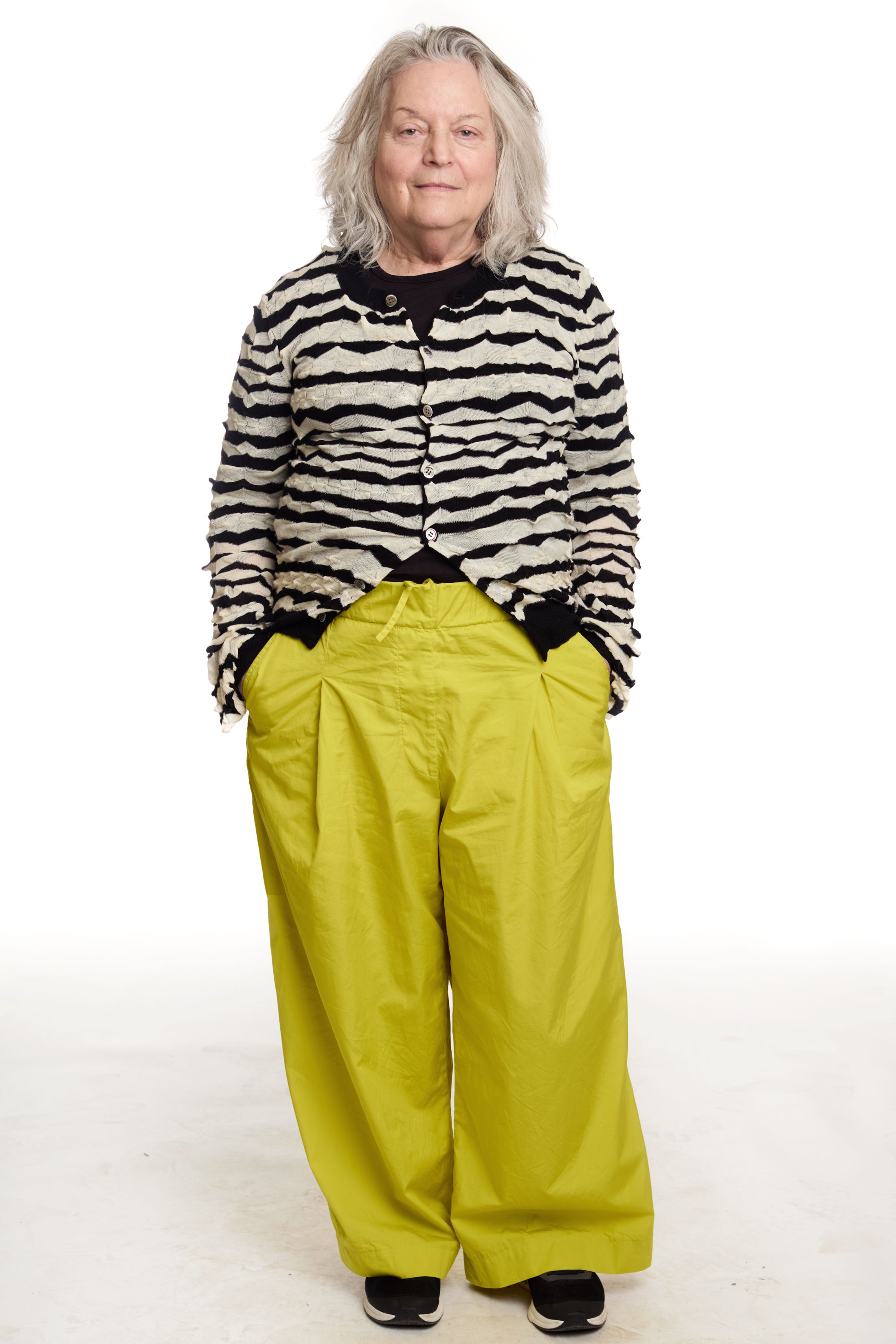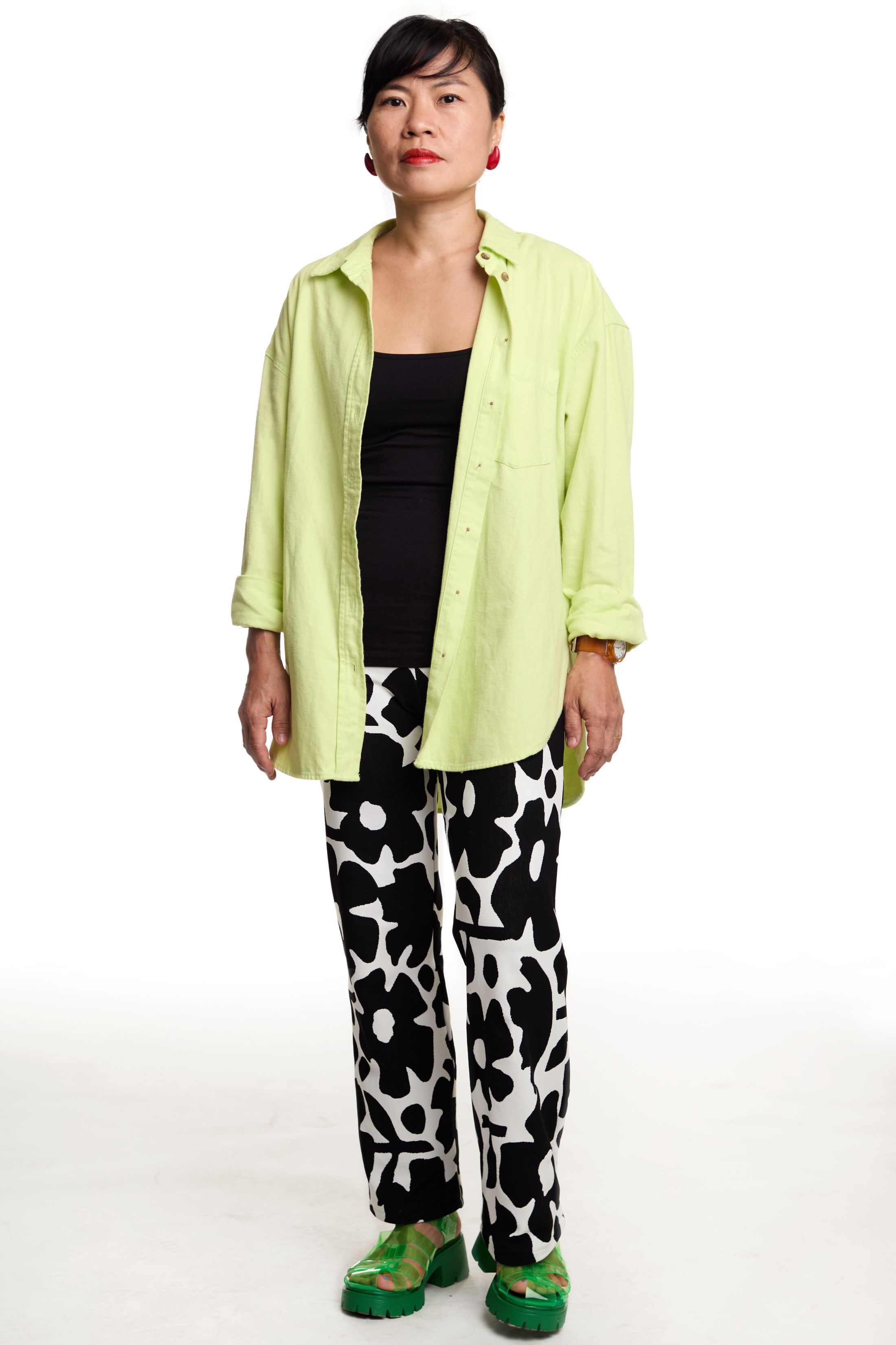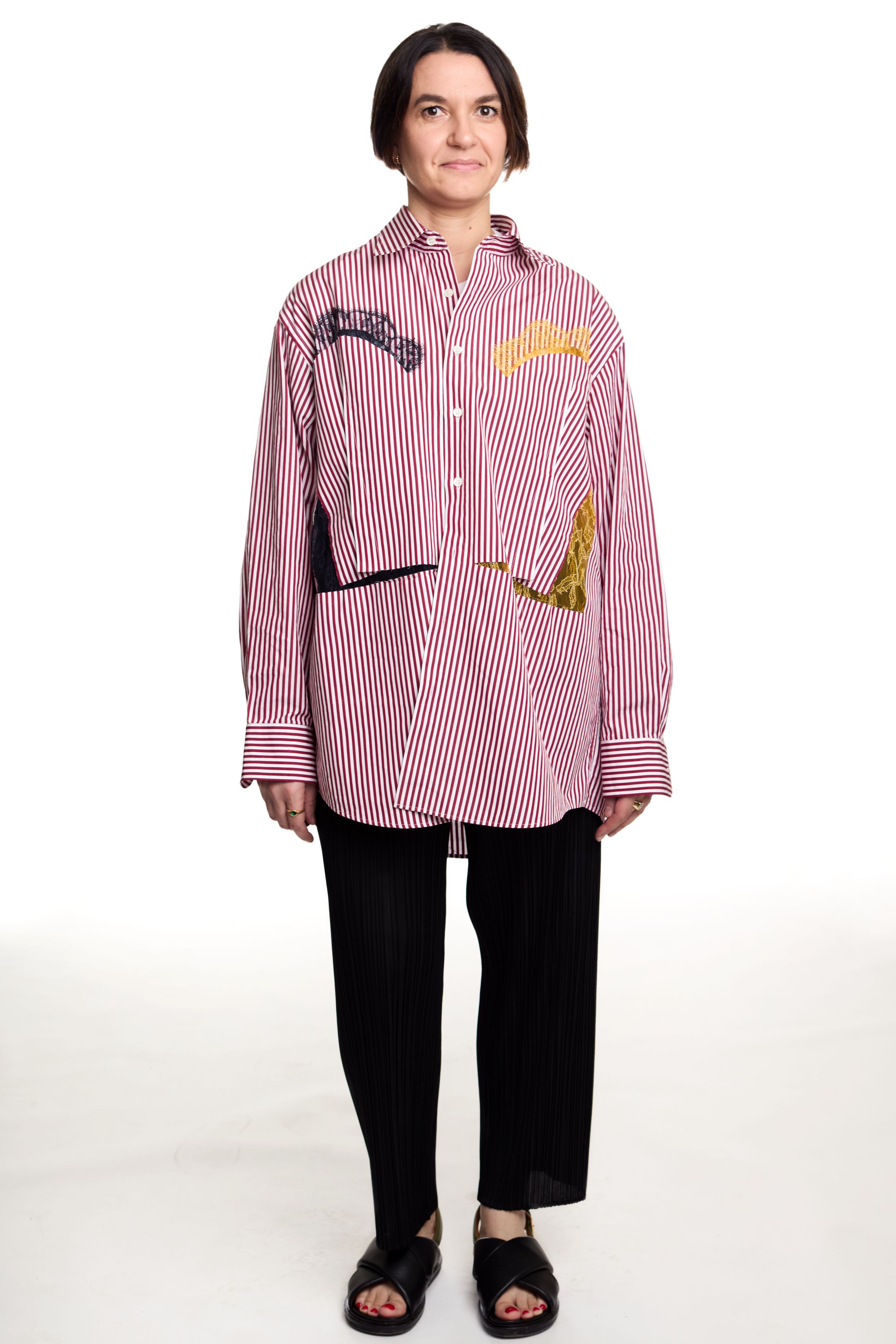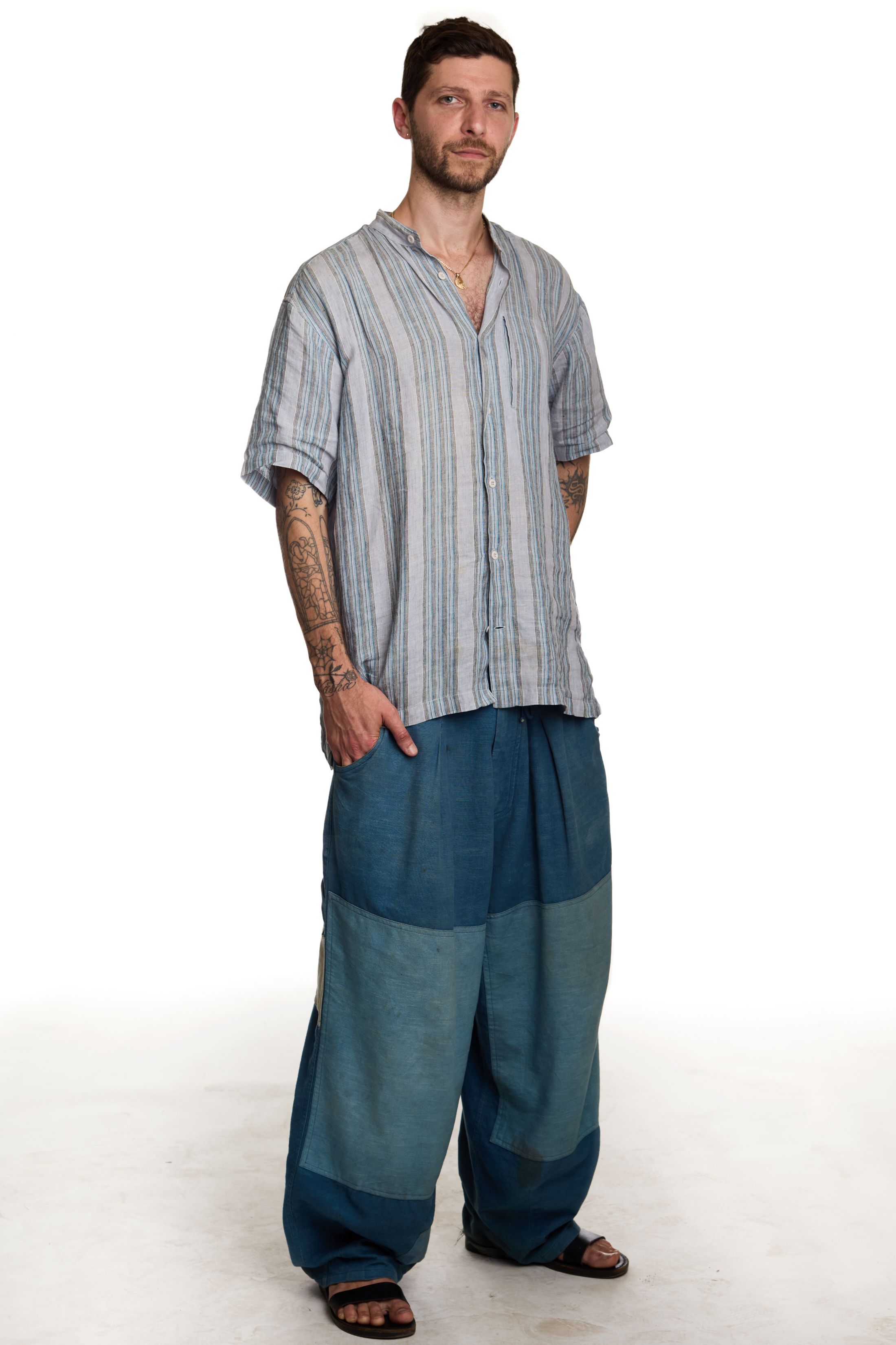 I’m kind of a cartoon character and get into one mood for extended periods of time. I have my go-to pants and shirt right now. The pants, I haven’t taken them off since I got them. They’re so beautiful. They’re Story mfg., my friend’s brand. It’s extremely slow fashion. Everything is hand-dyed and handwoven and yadda yadda. The shirt is thrifted. I love a collarless button-down.