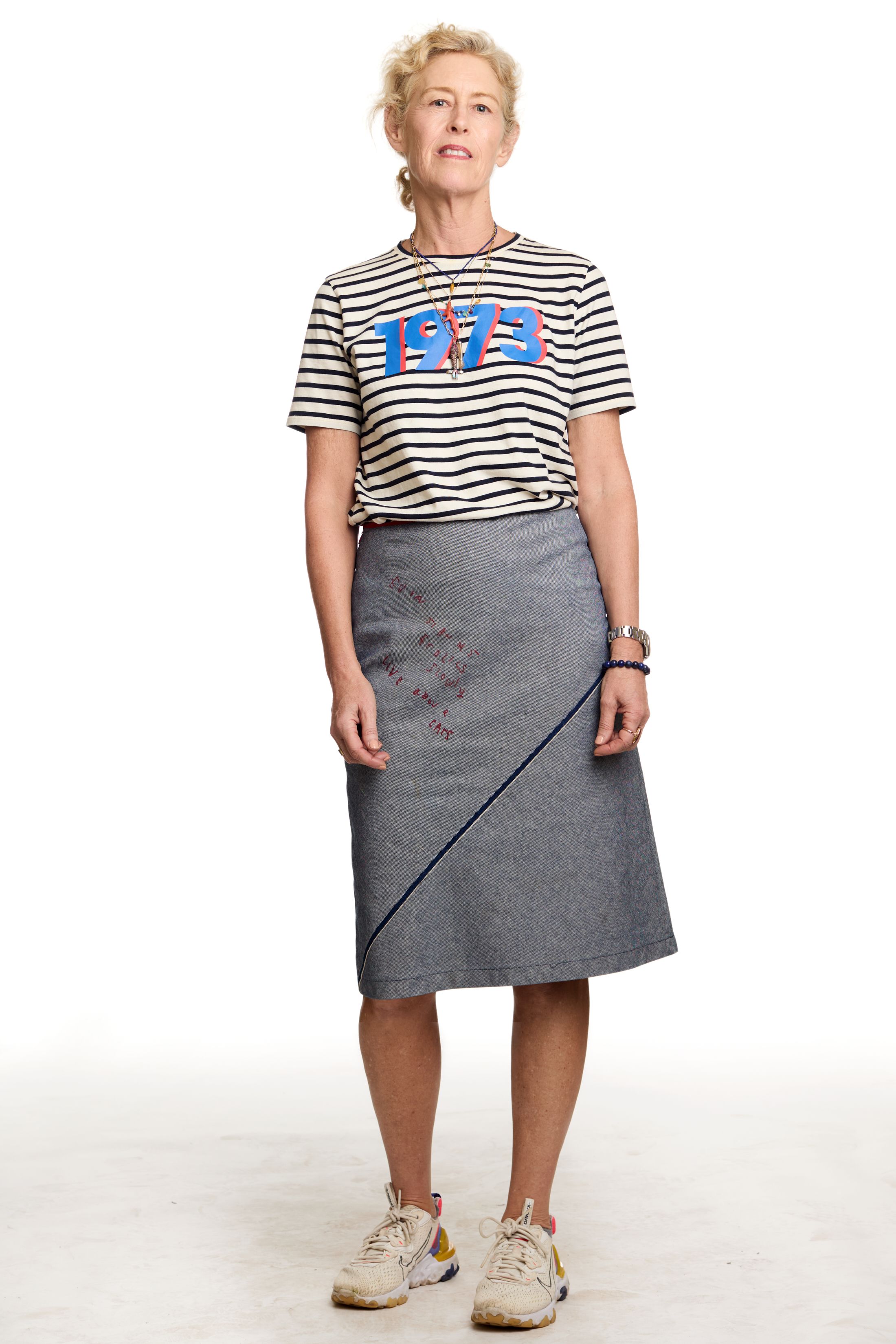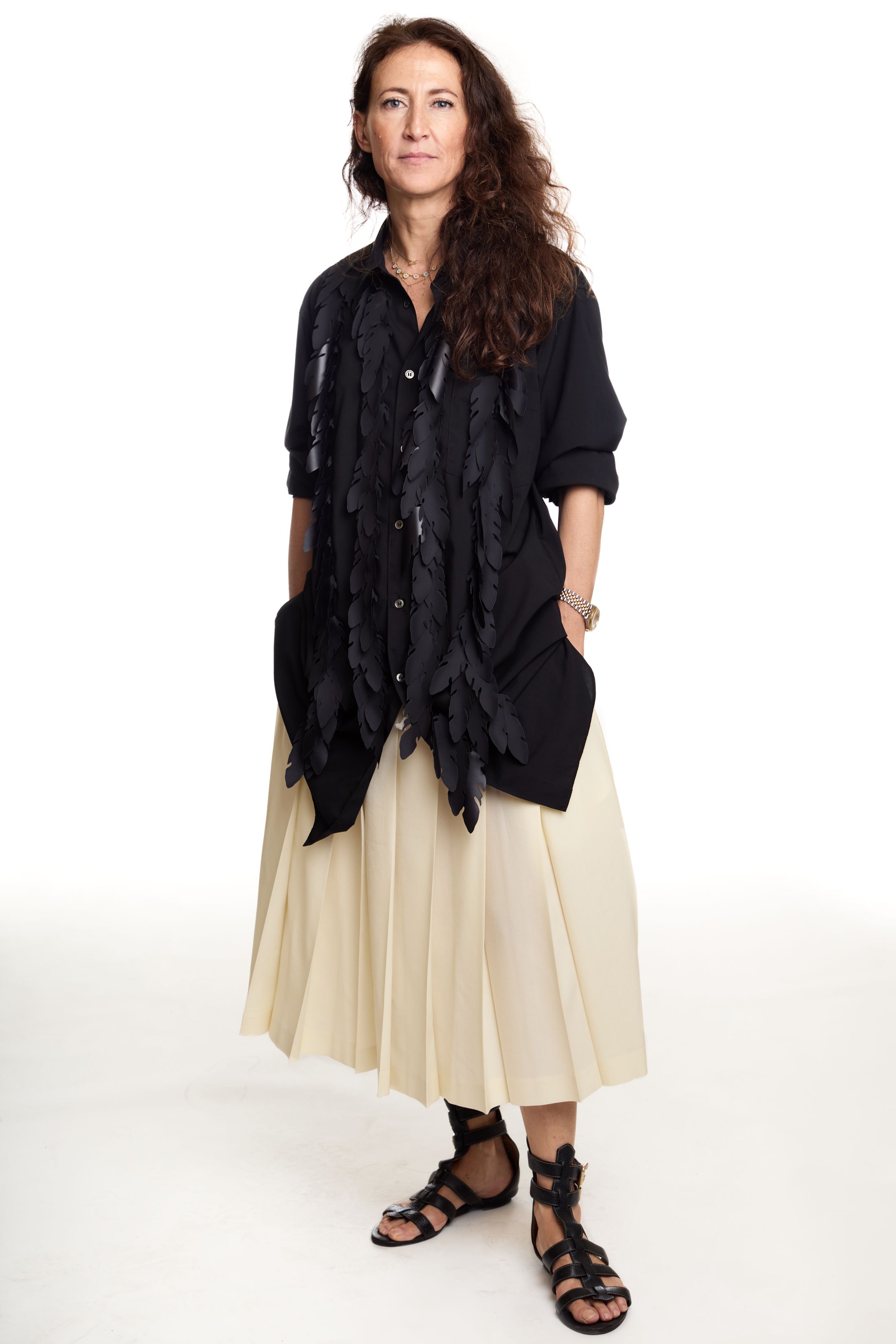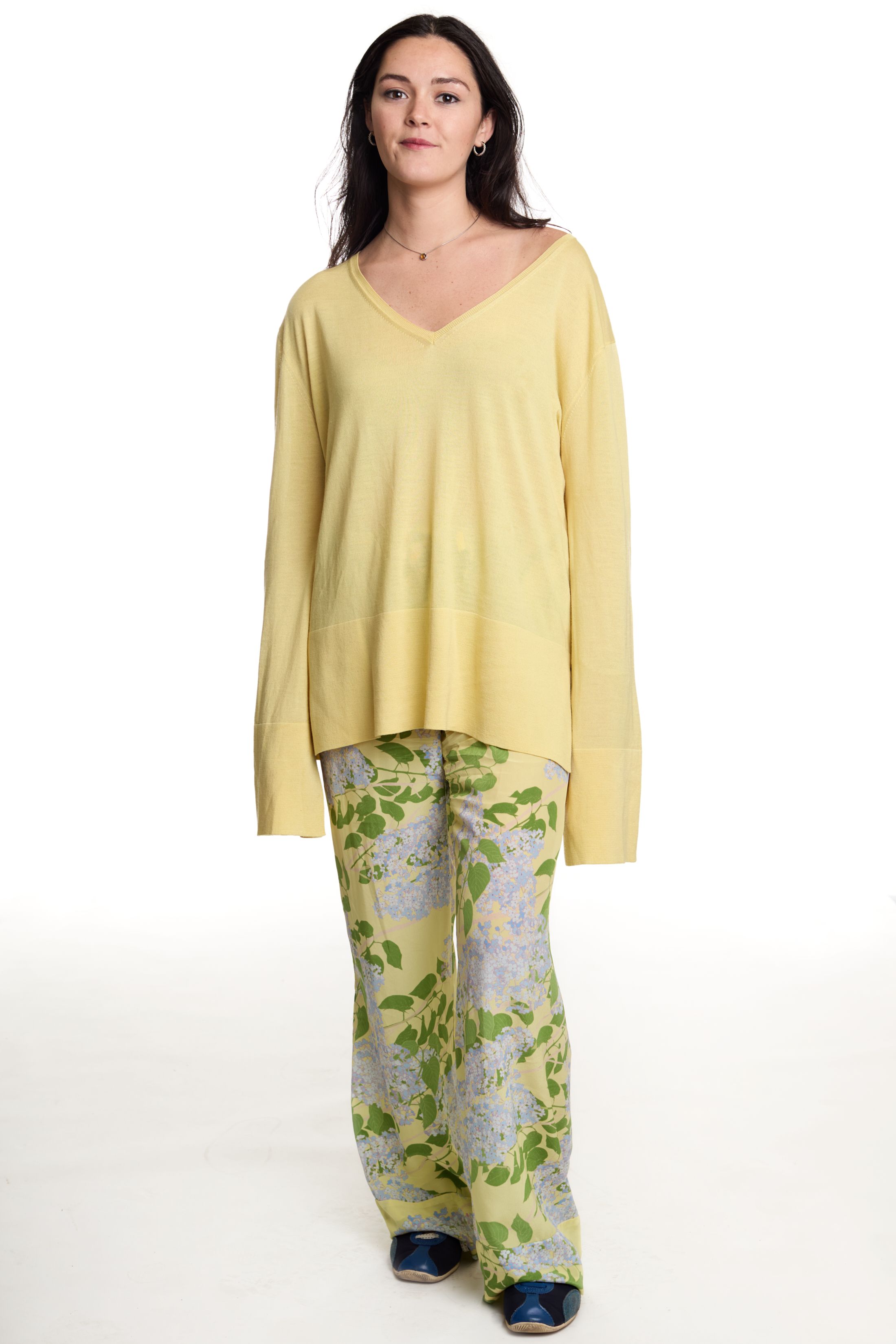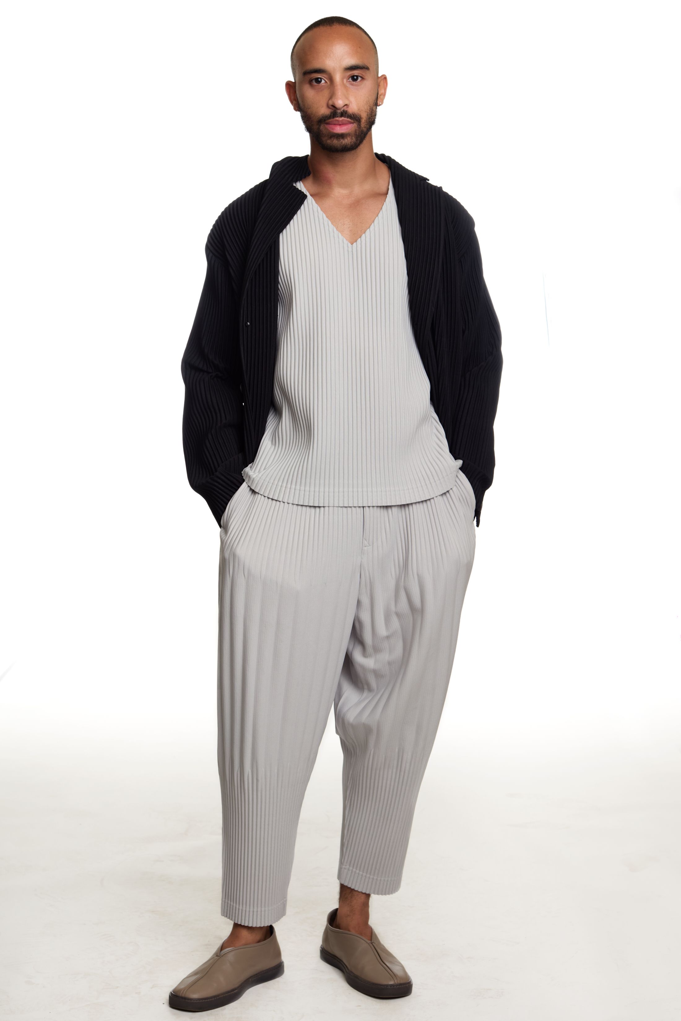 I’m kind of a cartoon character and get into one mood for extended periods of time. I have my go-to pants and shirt right now. The pants, I haven’t taken them off since I got them. They’re so beautiful. They’re Story mfg., my friend’s brand. It’s extremely slow fashion. Everything is hand-dyed and handwoven and yadda yadda. The shirt is thrifted. I love a collarless button-down.