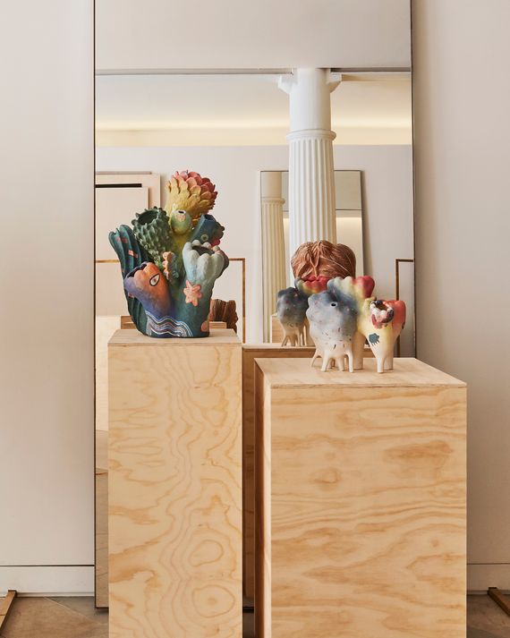 Baek, born in Seoul and raised in Queens, utilizes gradients of vibrant colors in her intricate, organic-looking ceramics, which evoke images of sea creatures and alien landscapes. The placement of Baek’s pieces, says Appleton, required some careful planning: “We wanted to display very colorful ceramics in front of the store’s large mirror so that you could get the 360 view of these incredible pieces, but we also opted for not having them on pedestals, because they’re also very delicate, and in putting this exhibition together we also had to be thinking about retail traffic!”