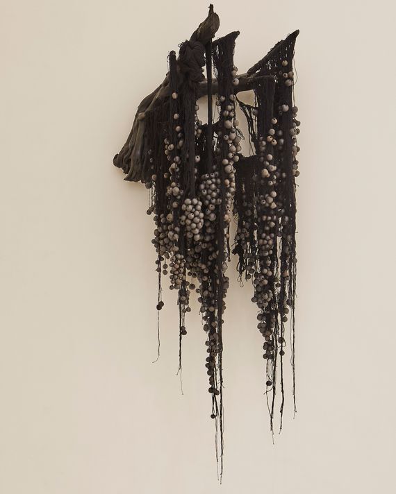James, a multidisciplinary artist born in Knoxville, Tennessee, and now based in Atlanta, crafted this wall hanging from thread and repurposed cloth using weaving techniques she notes are often associated with women’s labor and housework. The result is a piece of art that looks like ’70s macramé crossed with a wildly overgrown plant, the strands and globules in different shades of black. It’s lush but also slightly menacing.