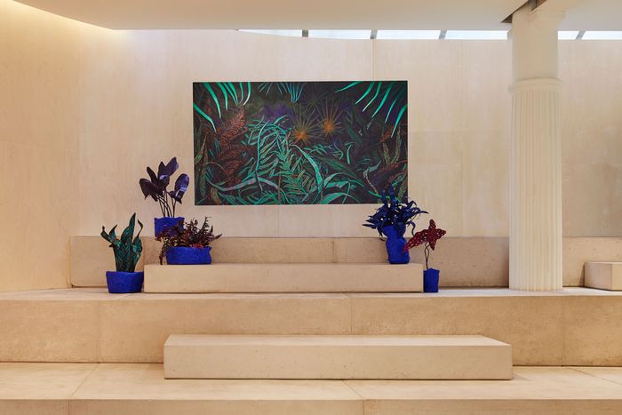 Taiwanese American artist Howng’s work is inspired by landscape theory and Victorian-era anthropology, and these pieces with cobalt-blue bases and leaves sculpted from wire and foam mix the exuberant shapes of well-loved houseplants with a colorful, fantastical sense of otherworldliness. They sit on the top layer of the store’s set of wood steps.