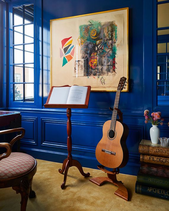 The Blue Room: The wife's music room also serves as a guest room: the daybed was custom-designed by Thomas with Clarence House Mohair. The walls are Benjamin Moore’s Patriot Blue. Photo: Genevieve Garruppo.