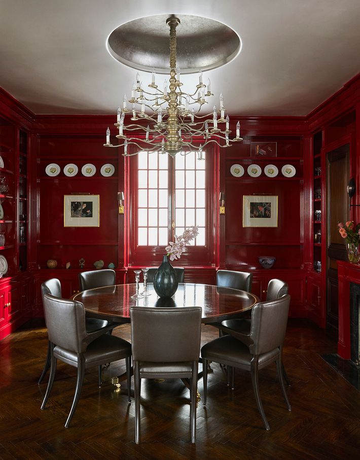 After the move and trying to incorporate as much of their original belongings as possible given the proportions of the new space, Thomas set to work. He designed custom pieces that complemented their art collection and continued those palettes by using a variety of high-gloss paint finishes and de Gournay custom wallpaper on all surfaces of the entry foyer, including the ceiling, so it feels like “you are walking through a cherry grove,” he says. He designed the powder room with one of the mirrors from the former townhouse that had been over the mantel in the dining room: “I just thought that the space was so small proportionally, why not open it up by using an overscaled mirror?” The walls are done with plaster embedded with gold, silver, and copper leaf.