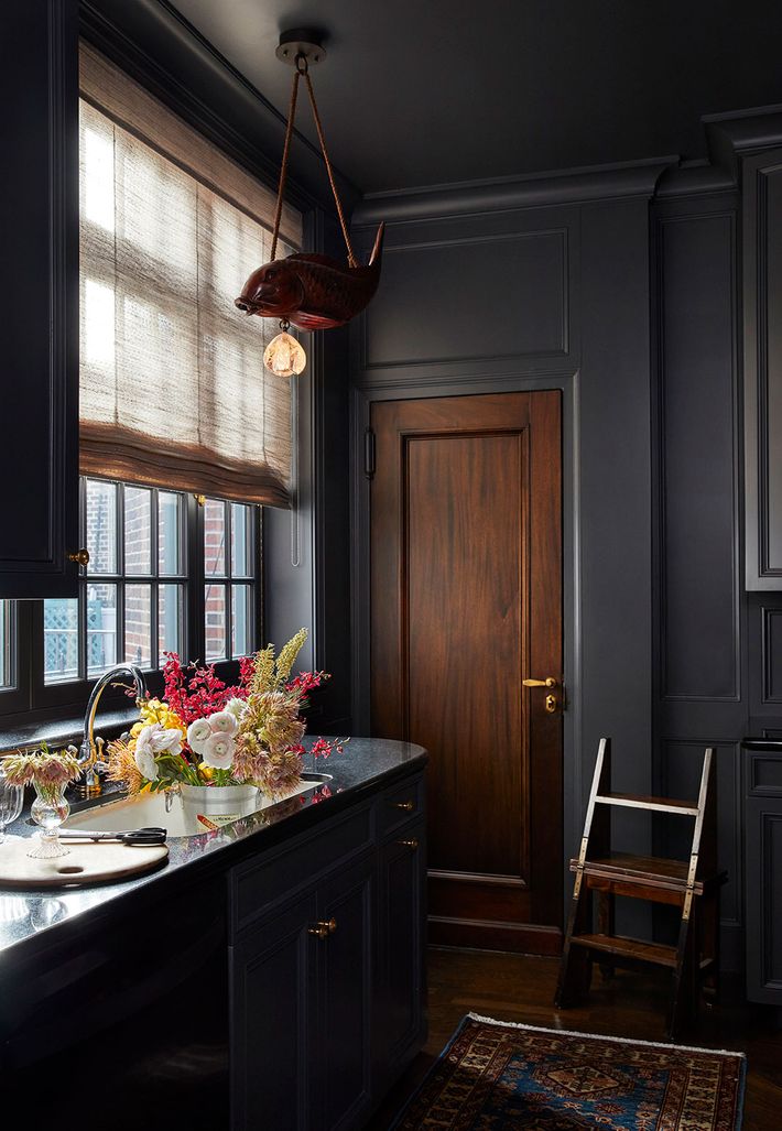 The Kitchen: “At one point, the kitchen was going to be fully renovated, but they decided to hold off and just give it a cosmetic makeover,” Thomas says. “All of the wood was stained grade; it wasn’t particularly remarkable, so we decided to paint the entire kitchen a color I adore, Benjamin Moore’s Cheating Heart; it’s almost black.” The pendant is from Guinevere Antiques.