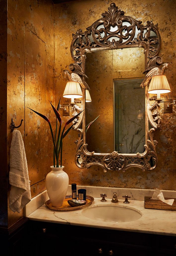 The Powder Room: The walls are a gold/silver-leaf application by Decorative Art & Design. The mirror is from the clients’ previous townhouse.