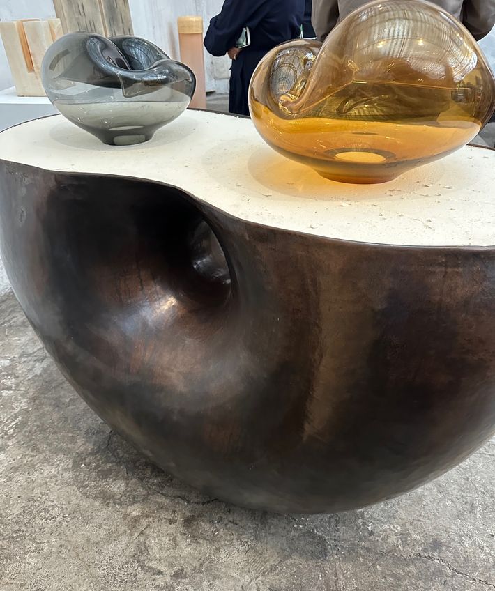 “I have been doing a series of copper pieces that are these forms that are sliced,” he explains. “This is a new piece that is not finished yet,” he says of the console. “I am trying to figure out if I want to do this very fine walnut burl, this very fine kind of Art Deco lacquered-wood top.” The two blown-glass pieces are part of his work with Vissio, a division of the glass company Nouvel, “a kind of more -xperimental creative glass project” that he started with Héctor Esrawe and Emiliano Godoy.