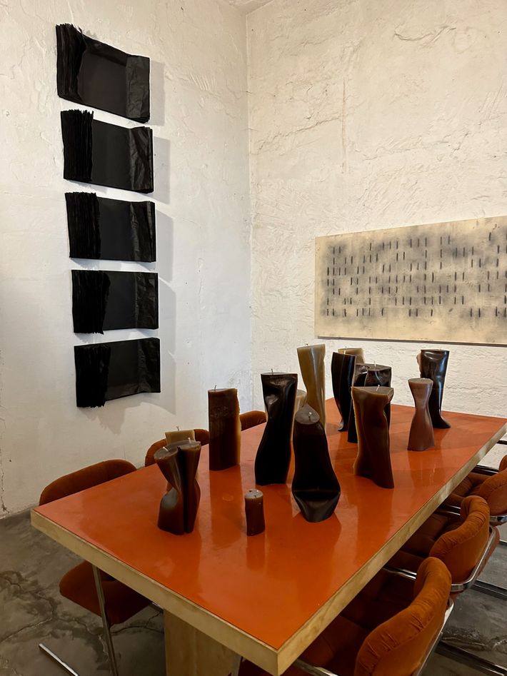 The vintage dining table and chairs were found in flea markets. The Tar paper art on the wall on the left, is glued roofing paper. The work on the right wall with charcoal markings “is kind of an exploration of mark-making taking charcoal as the earliest drawing material but turning it into this dialogue between analog and digital. And so it’s a binary code, the marks for the ones and zeroes.” The candles are of his design.