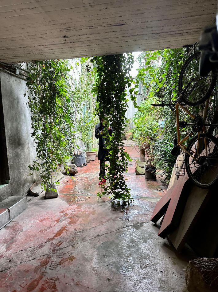 The courtyard leading to his studio is ripe with hanging vines beneath which you can stand hidden, as one of his fellow artists does in this photograph.