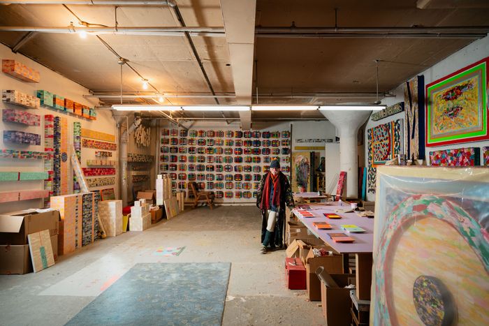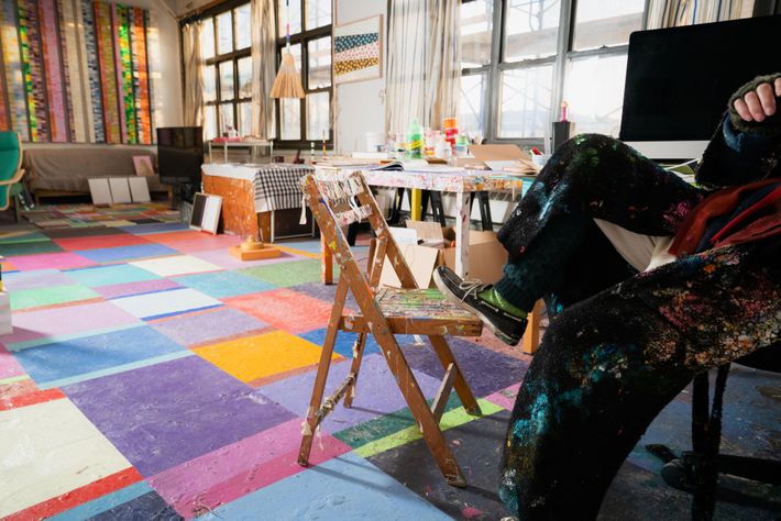 The elevator door opens to the top floor of a concrete building by the Williamsburg waterfront. To my right is a plain wooden chair labeled “new chair,” and beside it is a chair soaked in paint labeled “old chair.” A man with white fluffy hair, wearing a robe covered in paint and a tall blue beanie with a gold pom pom opens the door. Behind him I catch a glimpse of what looks like a huge multi-colored quilt, it’s his floor. This is the unique, vibrant, and whimsical world of Steve Silver, a painter who was born in the Bronx. He lives in a 5,000-square-foot loft that he moved into when Williamsburg was, as he describes it, “the wild west.” He has filled or painted nearly every corner of the loft, and there still isn’t enough space to hold his work.