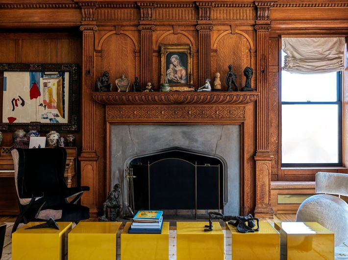 Arghirescu Rogard replaced the Shabby Chic sofa with a swoopy new one and paired it with a series of stackable cubes by Liz Hopkins that serve as the coffee table. The modernist furniture is juxtaposed with the original black-walnut paneling, mosaic entrance-hall floor, and beautiful stained-glass skylight.