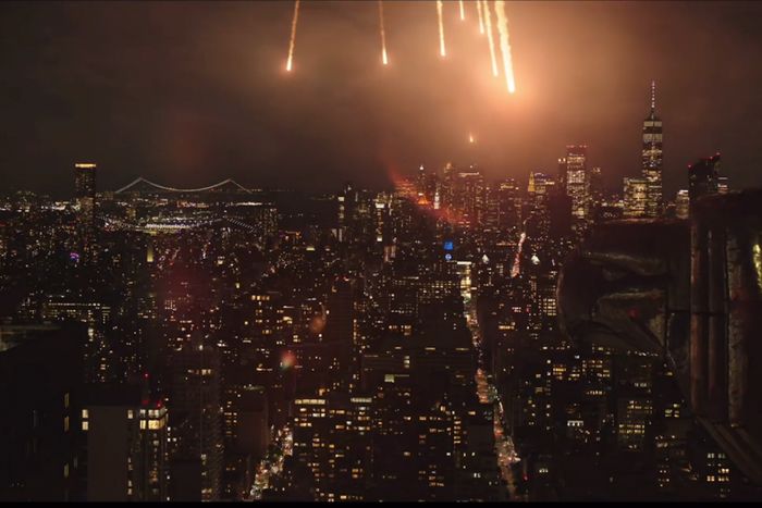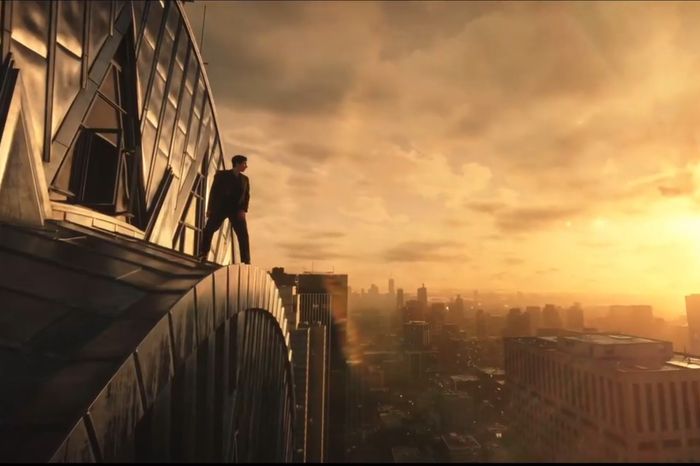 In another scene, we see shadowplay on a skyscraper. There’s some CGI work muddying the waters here, but I am pretty sure this is one of the postwar towers of Rockefeller Center, on the west side of Sixth Avenue. It appears to be a flipped image of 1211 Avenue of the Americas—which is the headquarters of News Corporation and home of the Fox News Channel. More crumbling-empire resonances, clearly, plus some tacit media criticism.