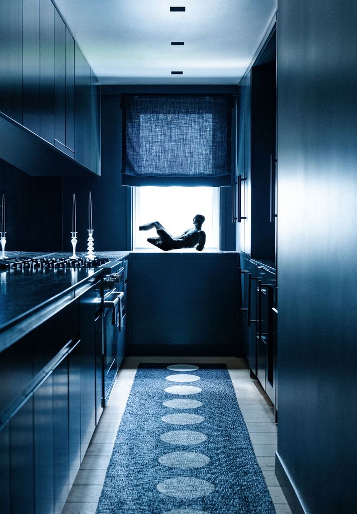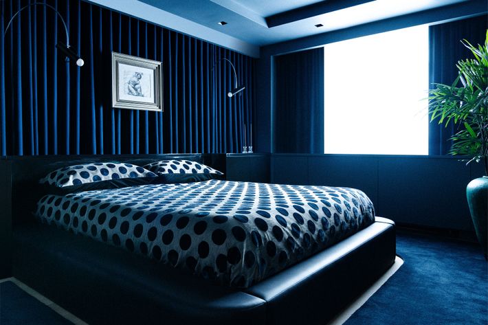 His design scheme included bronze mirrored walls, a custom silk living-room carpet, a brushed-alpaca curtain hiding the flat-screen, and velvet upholstery. Even the galley kitchen was given an edge of drama and seduction with anthracite cabinets and a black-mirror backsplash.
