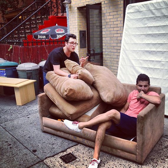 Later that year, I wanted to sign a lease with my friend Blake. We must’ve seen 40 apartments. Our budget was $2,400 for a two-bedroom. I wanted a big space, and he wanted Manhattan. I remember suggesting we could live off the Montrose L stop, and he was like, “It’s dangerous there, you don’t want to go past Bedford.” It came to a point where I told him I wouldn’t room with him unless we signed the next lease we could. We walked into this place on 5th and Avenue A with a bunch of other people seeing it at the same time. Our Realtor, this weird yoga guy named Adam, told us we needed to run to the ATM and put the deposit down immediately. We let both of our accounts go negative and ran back with a wad of cash. The landlord was this Russian guy named John Black — definitely a fake name — and he looked at us and said, “Why don’t you make more money? I had three jobs — you guys both have one job each.” We made $32,000 a year each, and the apartment was $2,450 a month. “How are you gonna pay for it?,” he asked. I freaked out and convinced myself he was right and that I should’ve been grinding harder. I told him I’d become a bartender, too. But I didn’t end up getting a new job, and we took the apartment. It was 450 square feet, and I paid a little bit more and got the bigger bedroom. It was so dumb of me to drain my bank account for it, but it was the best apartment. We ended up living there for two years. My bedroom was furnished with things I found on the street.