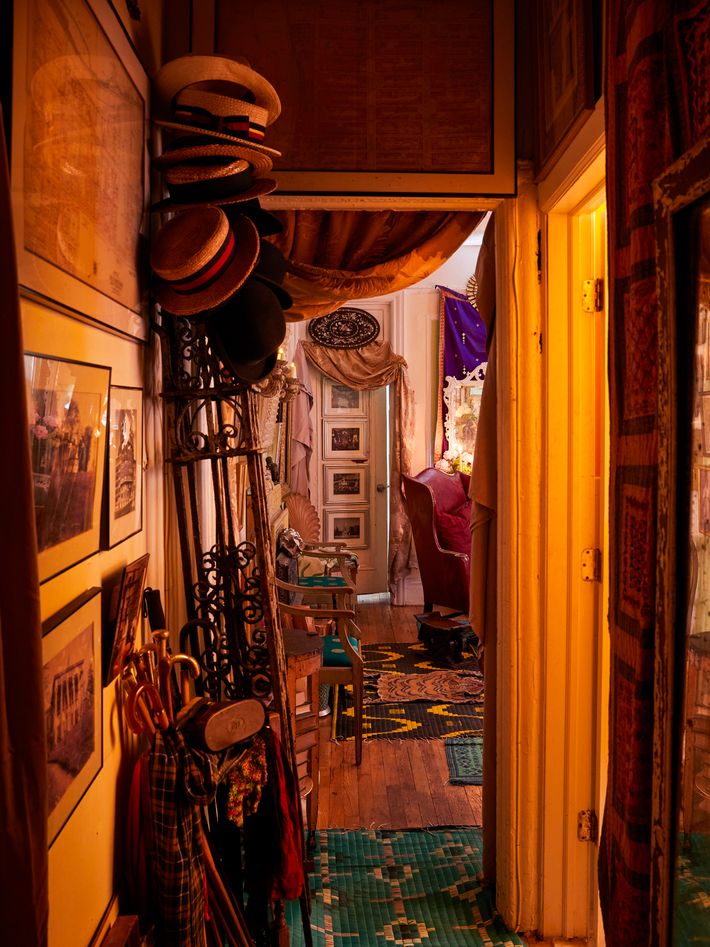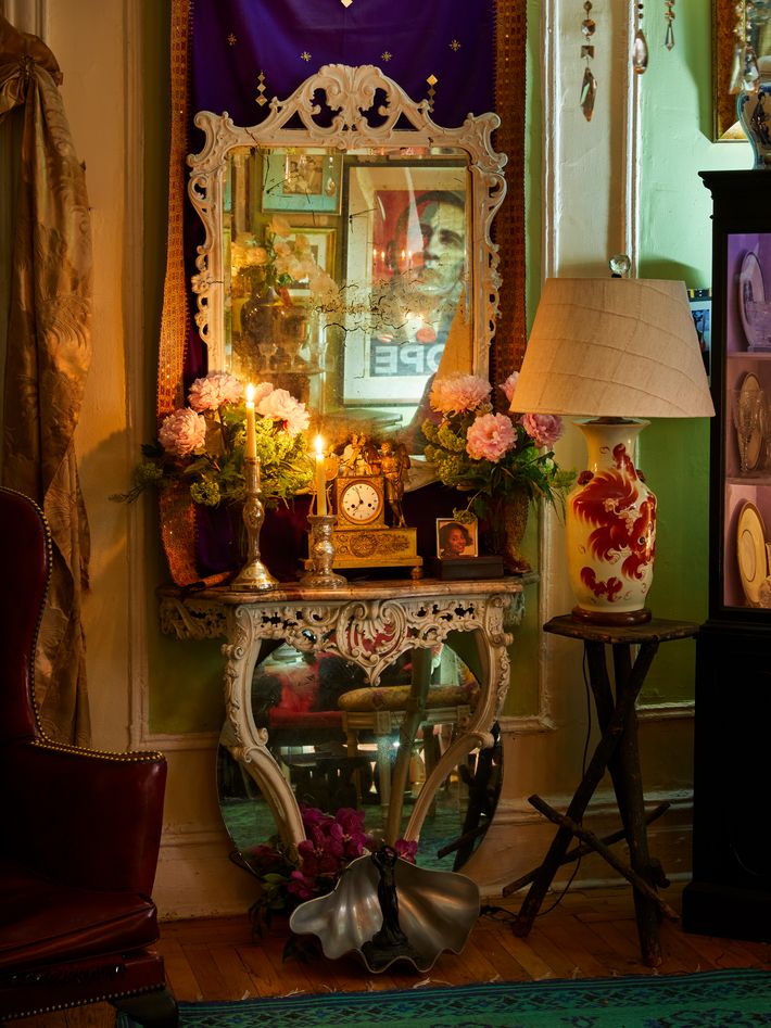 His rococo console (upon which he has placed an Empire Cupid clock) rests on “marvelous” washable woven plastic mats that he describes as “one of my happiest finds, sourced in shops on 116th Street, the main artery of Harlem’s Little West Africa.” Adams also points out a machinemade tapestry in one corner of the room “that once hung in the studio of twin photographers Morgan and Marvin Smith.” He continues: “They were next to the Apollo Theater. Billie Holiday, Harry Belafonte, and Lena Horne stood next to this.”