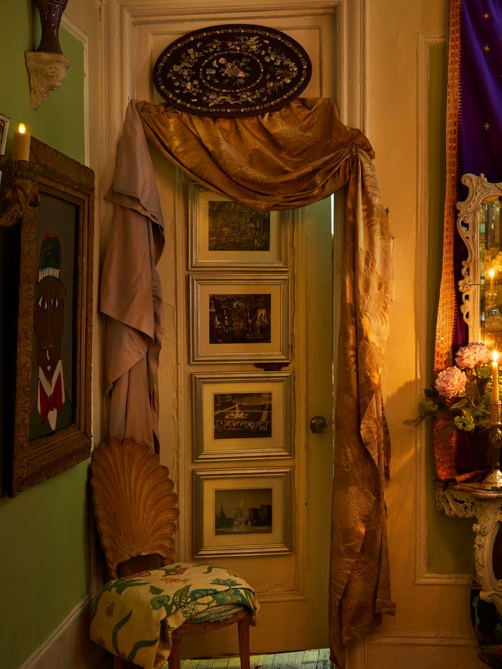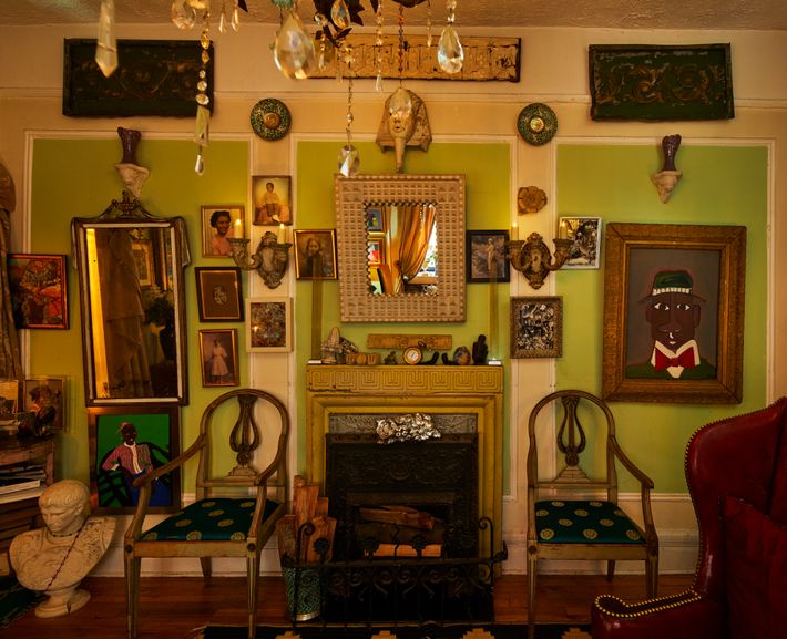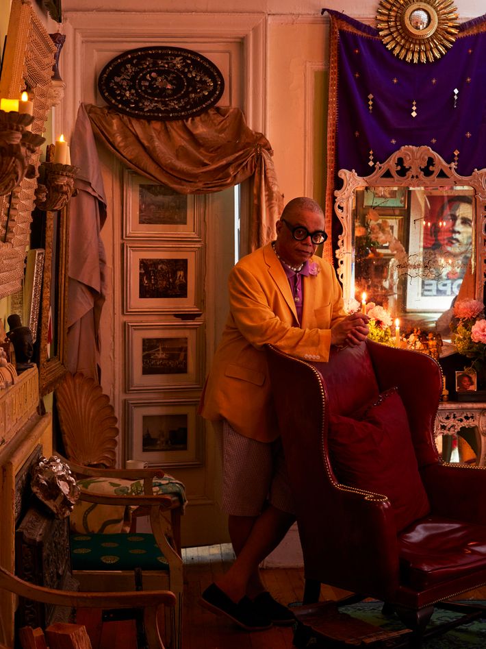 Ask about anything in his apartment, and you will not only learn its detailed provenance. “The plum-colored valence is from the Park Avenue apartment of a friend’s mother,” Adams says. “My friend Mario Buatta was her decorator, and Mario gave me the cloth and fringe to redo them.” He describes himself as, among other things, “an inveterate collector of treasures found in the trash.” The mantel over his fake fireplace, he recalls, “was spied as I awaited the bus one night on Madison Avenue near the Carlyle Hotel.” Nearby, there’s a fragment of a silvered garland of fruit and flowers from the Audubon Ballroom, where Malcolm X was assassinated. And then there is a piece of “egg-and-dart molding from the Lafayette Theater, where Orson Welles’s Voodoo Macbeth opened in 1936.” There are also many family photographs, including a life-size one of his father when he was a college basketball star.
