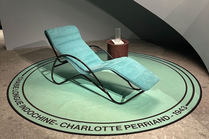 Cassina also displayed a turquoise Indochine chaise lounge by Charlotte Perriand. While the LC4 chaise, her collaboration with Pierre Jeanerret and Le Corbusier, often gets more attention, the Indochine chaise, made of three interlocking shapes, was designed by Perriand at the end of her pregnancy when she was mostly confined to bed, as the design with armrests allowed her to keep working. It was originally produced in rattan, but Cassina has remade it in tubular steel.