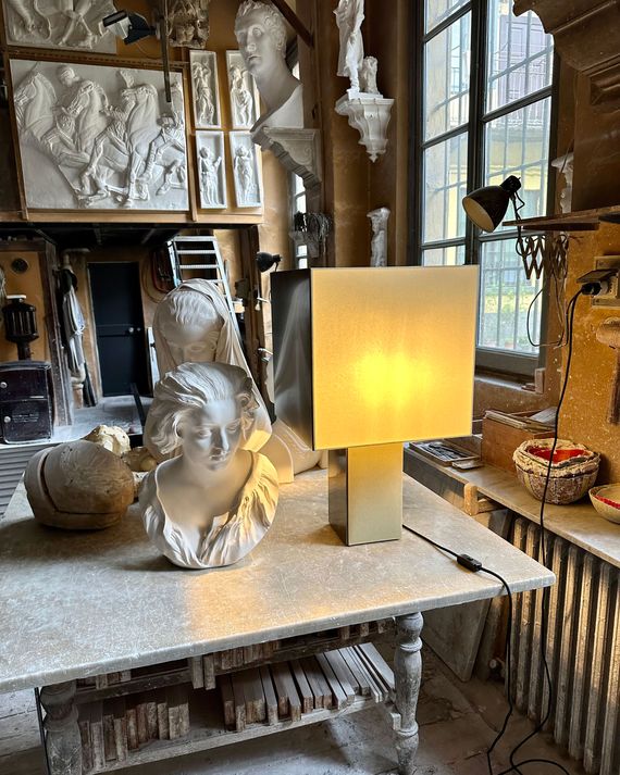 Beyond the villas, the founders of Milanese design studio Dimore, Emiliano Salci and Britt Moran, displayed a new collection of furniture under their new brand, Interni Venosta, at a working plaster atelier. The brand’s pieces pay homage to 1970’s Milanese interiors and are also inspired by the Bauhaus, Donald Judd, Carl Andre, Walter de Maria, Marcel Breuer, and Gerrit Rietveld. The gleaming walnut, glass, and steel collection, which includes a table lamp in brushed steel and paper, stood out against the backdrop of the plaster busts and wall panels. Overall, the effect was like going back in time to another century.