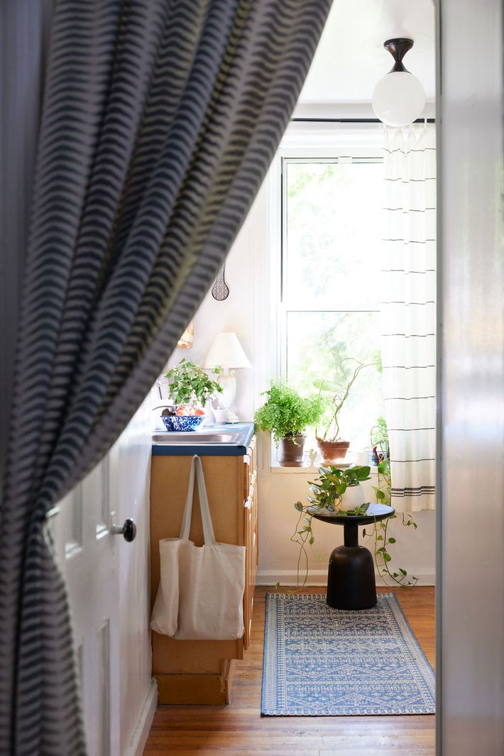 Dittrick decided to swap the locations of the bedroom and the living room, changed out the light fixtures, and covered the basic granite counters with waterproof contact paper. He also replaced a door with a curtain for more space in the guest-room area. Overall, the apartment has more of the modern sensibilities he developed by working at West Elm and knowing designers. “I wanted my home to feel lived in and personal and welcoming and cozy but also to have some air and some space. And not be overwhelming.”
