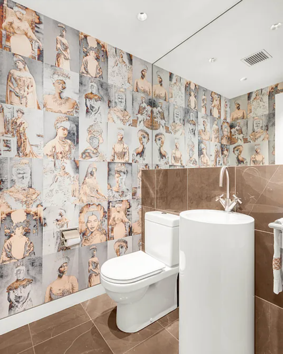 A four-bedroom in an old-school co-op — the first built on East End Avenue — gets wild in a powder room, with a photo in the listing showing limited-edition wallpaper from the design brand Trove.