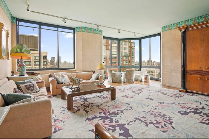 Curious who had decorated a fabulous 1980s time capsule with a Harvard throw pillow, we looked up the address of the living room in this listing shot. It comes up as the location for the law practice of Jay Goldberg, who represented Trump.