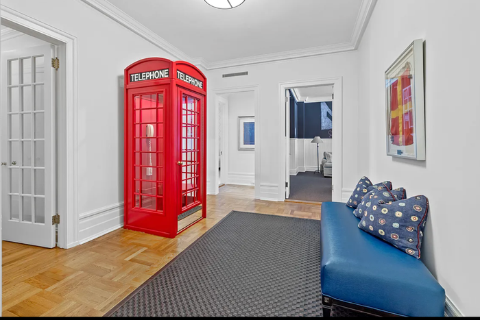 Most New Yorkers have so little space that the idea of having both a toaster oven and a toaster would be ludicrous, but this co-op has 13 rooms, over 5,500 square feet, and a listing that describes separate “wings.” So of course there’s room for extras, and a photo of a foyer shows a British-style telephone booth around what’s either a classic landline or the phone that calls down to the doorman.