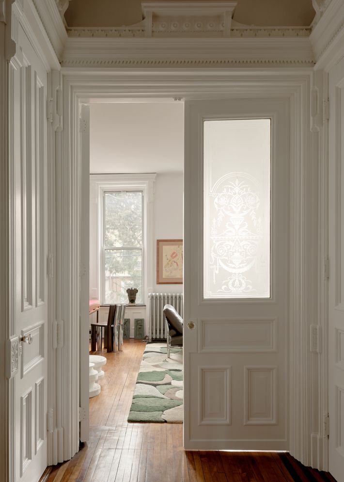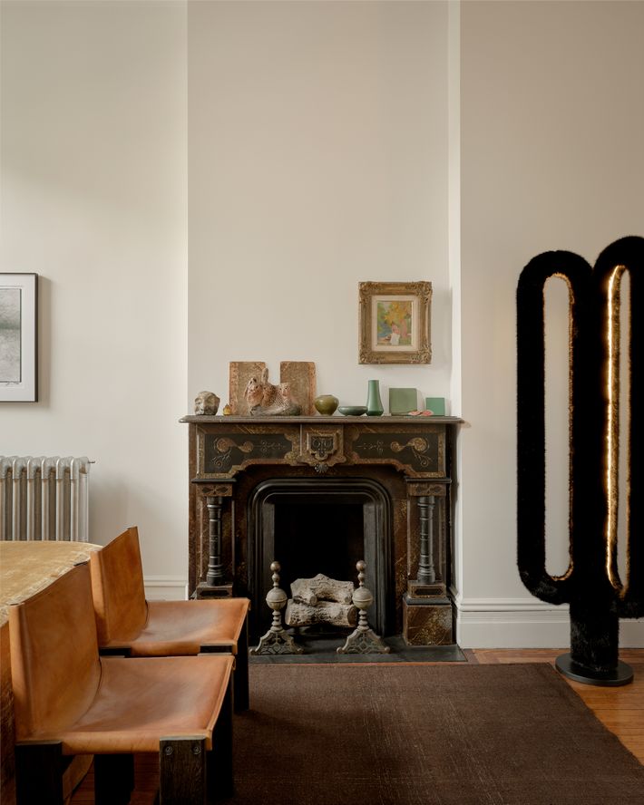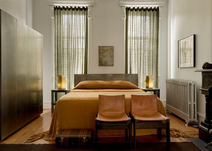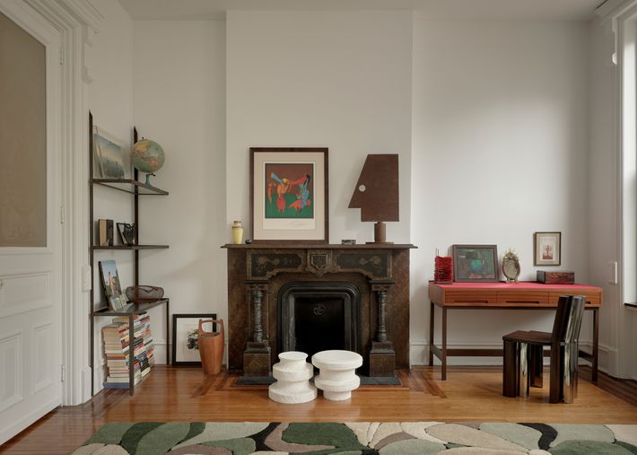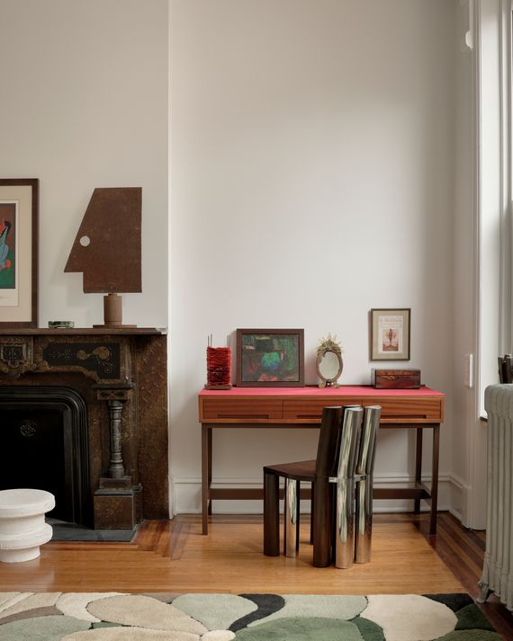 He created the custom-made gold silk-velvet throw and Viso mohair blanket in complementary tones. Then there are family heirlooms, like the vibrant patterned rug in the living room designed by Worsek’s grandmother, who was an interior designer in Chicago. “She designed it with Edward Fields in the ’80s, and was obviously fearlessly bold.” There are also quirky surprises, as in the pastel above the sofa that was originally taped to the floor of the couple’s former Park Slope apartment. “It became a sort of map for everyone who traversed our hallway,” Silberberg says.