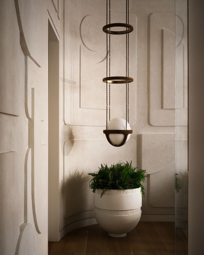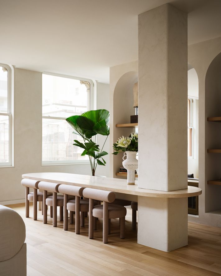 The space, he felt, had to flow well. “The one thing I’ve always hated about these lofty apartments are those columns in the middle of the room,” he says Godbold. His solution in the dining area was to float a table off a column so that it “was integrated into the design and wasn’t just sitting there.” It references a table from the 1930s by Hans and Wassili Luckhardt and Alfons Anker.