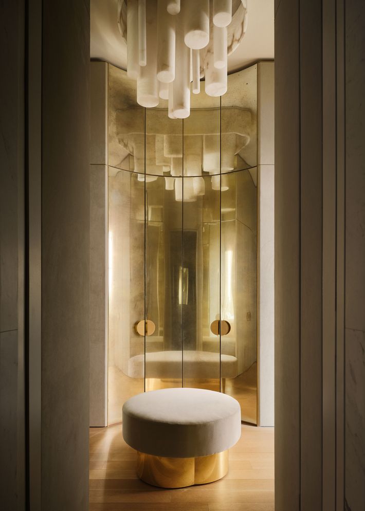 Godbold also referenced his favorite sci-fi movie sets for decorative elements. “The plasterwork was inspired by a wall detail I had seen in Cloud City in The Empire Strikes Back.” The dressing room gives a nod to the Fortress of Solitude in the 1978 Superman movie.