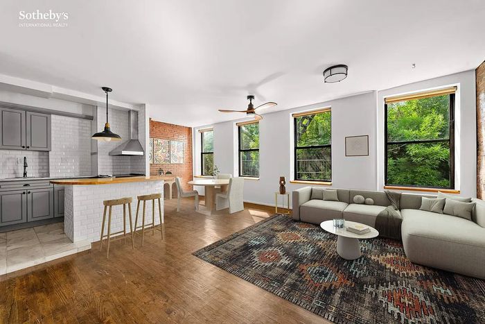 This one-bedroom, one-bath co-op apartment has four large windows in an expansive, open living space overlooking a tree-lined street. It also has all the classic finishes: hardwood floors, exposed brick, and a sleek kitchen with stainless steel and subway tile. Formerly a two-bedroom, it’s now configured with a small bedroom at the back. The building is a walk-up a few blocks from Katz’s and Mercury Lounge, with a shared courtyard, bike storage, and a laundry room.